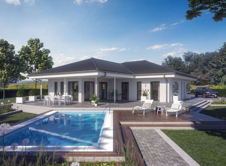 Der Winkelbungalow ist nach wie vor ein gefragter Haustyp. Kein Wunder, schließlich bietet er zahlreiche Vorteile. Zum einen ist der geschützte Winkel der perfekte Ort für eine gemütliche, überdachte Terrasse. Zum anderen lassen sich durch die besondere Form die Wohnbereiche im Innern einfacher trennen.