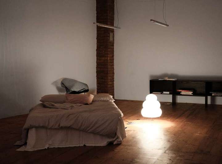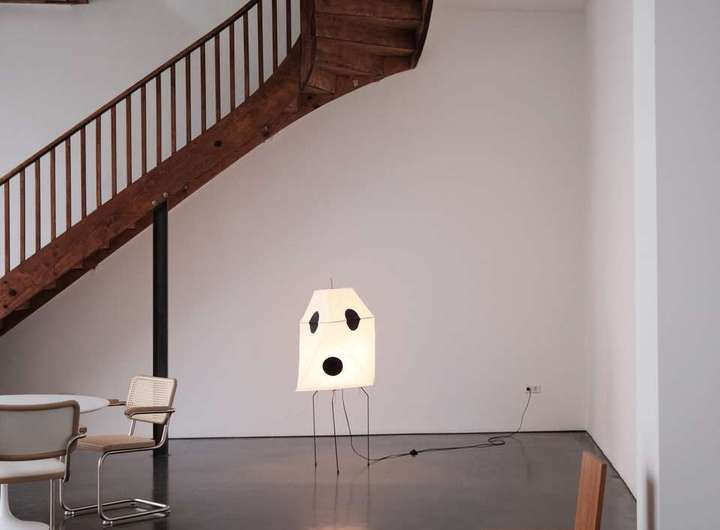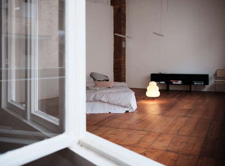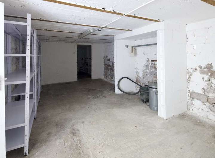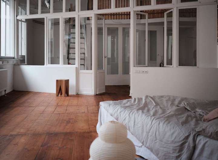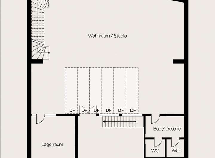 Die geschwungene Treppe aus Holz bildet einen schönen Kontrast zu der klaren, schlichten Architektur des Gebäudes und führt hinauf ins Obergeschoss, wo sich ein Vorraum befindet, der mit einem Fenster/Tür-Element vom Schlafzimmer getrennt ist. Früher war hier oben eine kleine Küche und ein Essbereich eingerichtet, als der untere Raum noch als Fotostudio fungierte. Über dem Treppenaufgang befindet sich außerdem eine ca. 10 Quadratmeter große Empore die sich perfekt als Leseecke oder Stauraum nutzen lässt. Praktisch: vom Innenhof aus erreicht man über eine separate Außentreppe den über 50 Quadratmeter großen Keller, der in 4 Zellen aufgeteilt ist und zusätzlichen Lagerraum bietet. Das Schlafzimmer im Obergeschoss ist ausgesprochen groß und könnte auch bequem in zwei Zimmer und einen Flur umgebaut werden. Es ist vollständig mit Holzdielen ausgelegt und die Wände geben teilweise den Blick auf die ursprüngliche Backsteinwand frei. Ideal als großes Schlafzimmer, Arbeitszimmer oder Einzimmerwohnung.