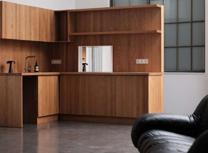 Durch das teilverglaste Dach schimmert natürliches Sonnenlicht herein, wodurch eine besonders angenehme Atmosphäre entsteht. Die komplette Front lässt sich durch einen großen Vorhang blickdicht verschließen, was sowohl der Akustik als auch der Atmosphäre zugute kommt. Trotz der großen Fläche fühlt sich das Loft dadurch an, wie ein echter Wohnraum. Ein praktischer Lager-/Abstellraum, der auch als Serverraum genutzt werden kann und ein modern ausgestattetes Badezimmer mit Duschbad und WC befinden sich ebenfalls im Erdgeschoss. Zuletzt wurde außerdem eine Küchenzeile aus Holz integriert, die einen angenehmen Kontrast zum industriellen Stil der Wohnung schafft.