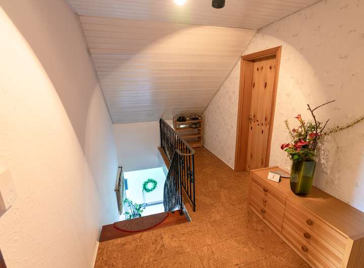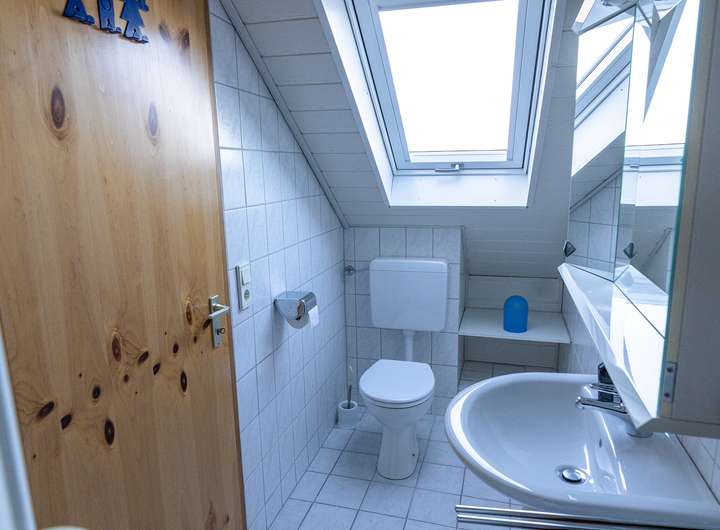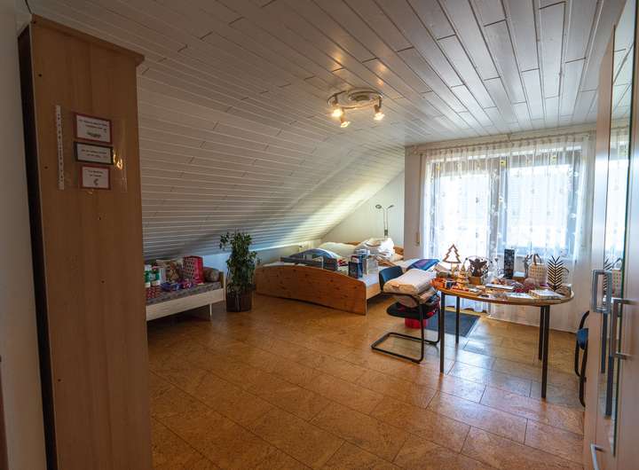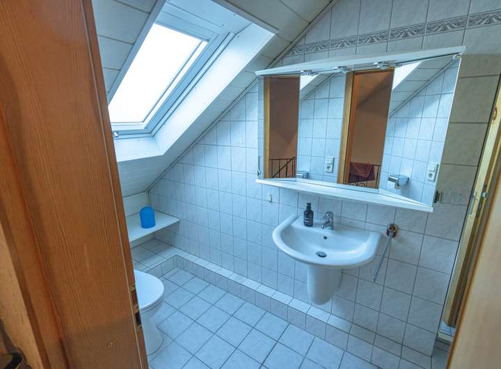 Das Dachgeschoss ist ca. 55 m² Wohnfläche ausgebaut und bietet zwei großzügige Zimmer, einen Balkon sowie ein helles Tageslicht-Duschbad.