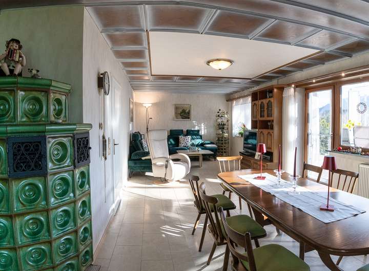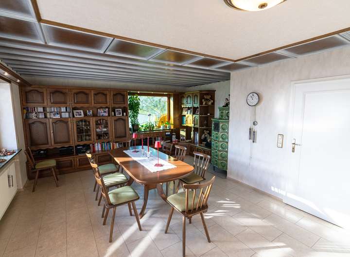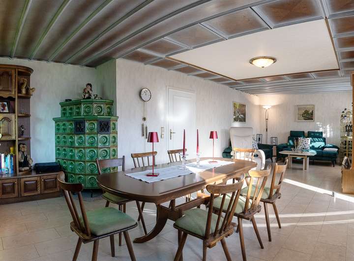 Herzstück des Hauses ist jedoch der großzügige Wohn- und Essbereich, der Ihnen viel Raum für gemeinsame Stunden bietet. Der Kachelofen schenkt an kalten Tagen angenehme, behagliche Wärme und macht den Raum zu einem echten Wohlfühlort. Von hier aus gelangen Sie direkt zu Ihrem überdachten Freisitz und zur Terrasse – ein idealer Platz für gemütliche Abende, sonnige Nachmittage oder ein entspanntes Frühstück im Freien.