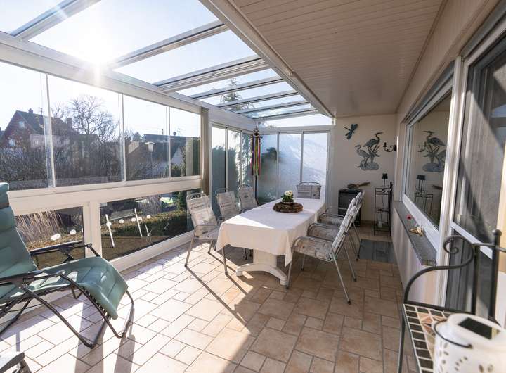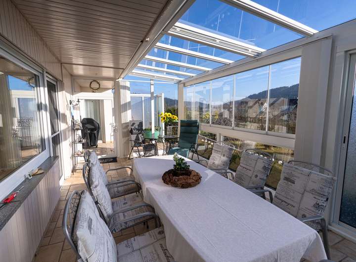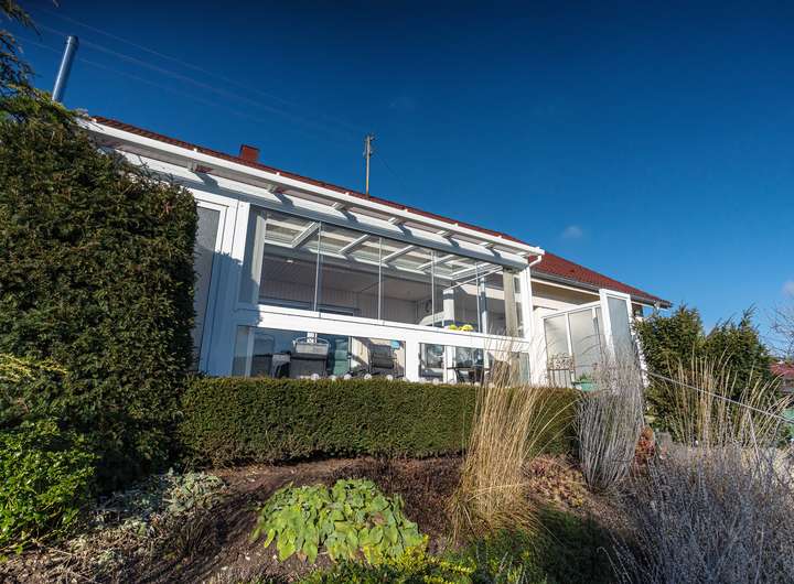 An sonnigen Wintertagen verwöhnt Sie die Sonne im geschützten Freisitz, während an heißen Sommertagen die integrierte Beschattung für kühle, angenehme Temperaturen sorgt.