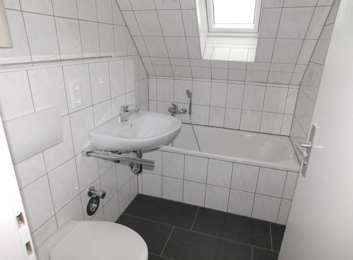 Bad mit Fenster; Boden in Holzoptik; tapeziert; Zentralheizung; Gas; Wärmeschutzverglasung; Mieterkeller; Waschküche; Dachgeschoss; Mehrfamilienhaus; Badewanne eingemauert;
