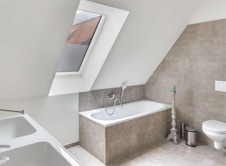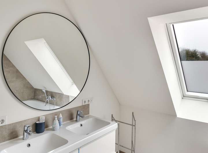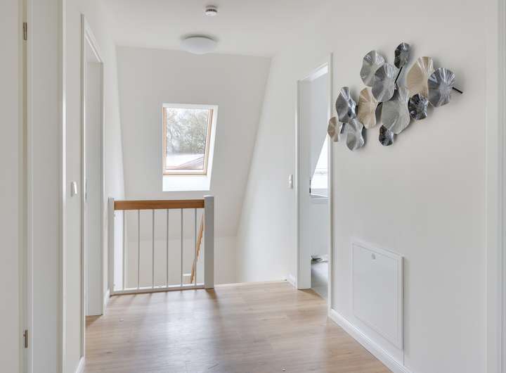 Im Obergeschoss befinden sich die privaten Räume, darunter ein großzügiges Schlafzimmer sowie drei weitere Zimmer, die sich als Kinderzimmer, Büro oder Gästezimmer eignen. Das Badezimmer, ausgestattet mit Badewanne und ebenerdiger Dusche, sowie modernen Fliesen und Armaturen, bietet eine Wohlfühloase zum Entspannen.