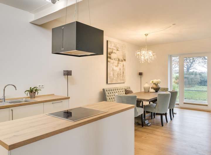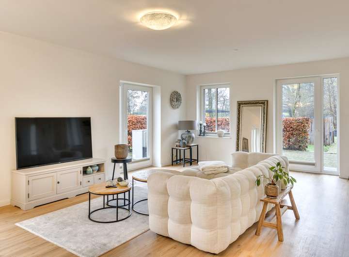 Das Erdgeschoss überzeugt durch einen großzügigen Wohn-Ess-Bereich, der in offener Verbindung mit der modernen Wohnküche steht. Die vielen Fensterflächen sorgen für eine helle, freundliche Atmosphäre und einen freien Blick in den zugehörigen Garten mit Terrasse und die umliegende Natur. Die hochwertige Einbauküche ist mit modernen Geräten ausgestattet und bietet viel Platz zum gemeinsamen Kochen und genießen. Hier kann das Leben stattfinden.