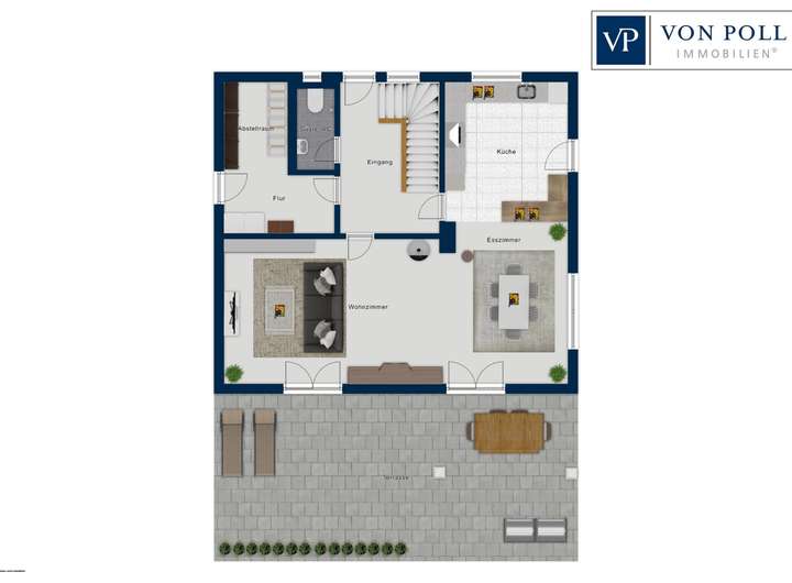 Im Erdgeschoss erwarten Sie ein großzügiger, lichtdurchfluteter Wohn- und Essbereich mit direktem Zugang zur teilweise überdachten Terrasse.