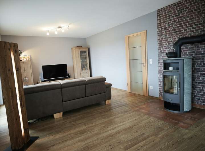 Im großzügigen Wohn- und Essbereich sorgt ein Kaminofen bei Bedarf für stimmungsvolle Wärme.