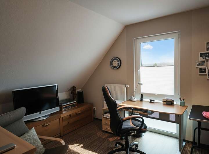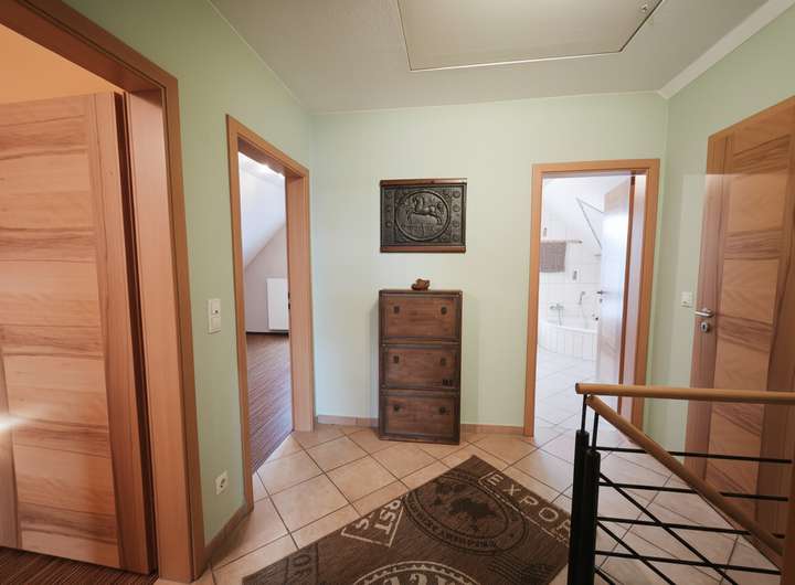 Das Obergeschoss verfügt über drei gut geschnittene Schlafzimmer, die Rückzugsmöglichkeiten für die ganze Familie bieten. Das gepflegte Badezimmer ist funktional und modern ausgestattet.
