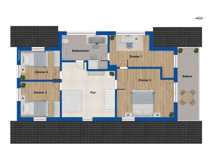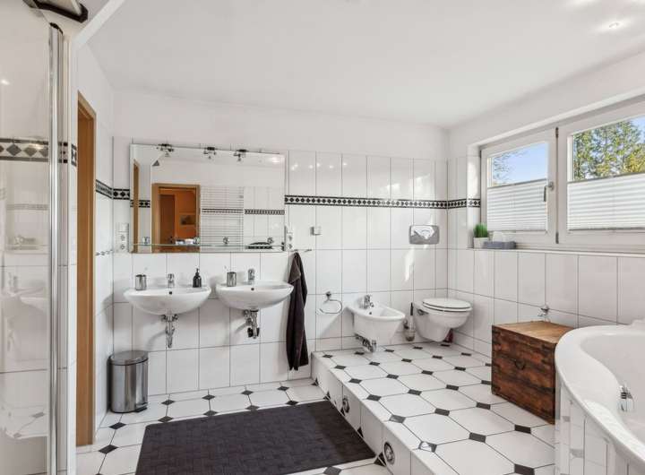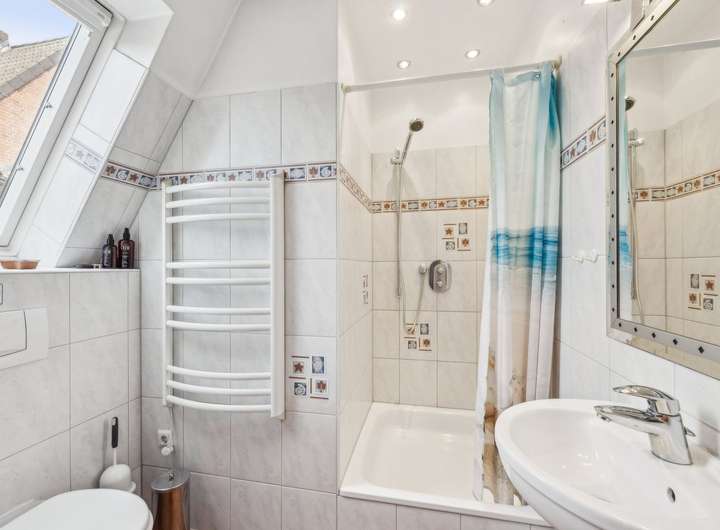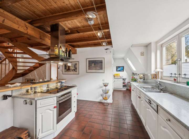 Im Dachgeschoss erwarten Sie ein weiß gefliestes Tageslichtbad mit Dusche, Badewanne und zwei Waschtischen sowie vier gut geschnittene Zimmer. Ein herrlicher Balkon rundet das Raumangebot auf dieser Ebene ab. Auch hier besteht die Möglichkeit, Räume individuell zusammenzulegen. Der wohnlich ausgebaute Spitzboden bietet zusätzliche Nutzmöglichkeiten, ist jedoch nicht in der Wohnfläche enthalten.