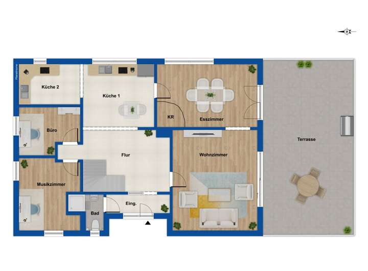 Das Erdgeschoss überzeugt durch ein gemütliches Wohnzimmer mit direktem Terrassenzugang, ein separates Esszimmer mit stimmungsvollem Ofen, eine großzügige Küche mit angrenzendem Hauswirtschaftsraum, zwei flexibel nutzbare Zimmer – auch zusammenlegbar – sowie ein Gäste-WC mit Dusche.