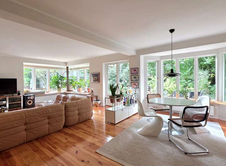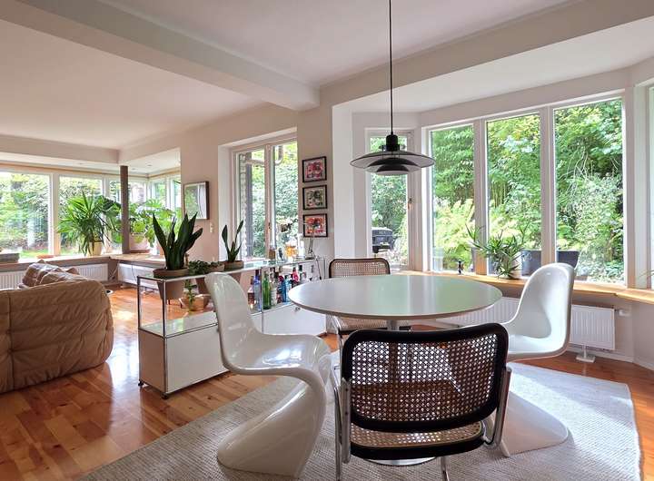 Ein besonderes Highlight ist der eingewachsene Garten, der absolute Privatsphäre bietet – eine grüne Oase zum Entspannen und Genießen. Großzügige Terrassenbereiche schaffen fließende Übergänge zwischen Innen- und Außenraum.