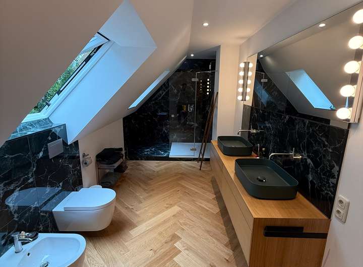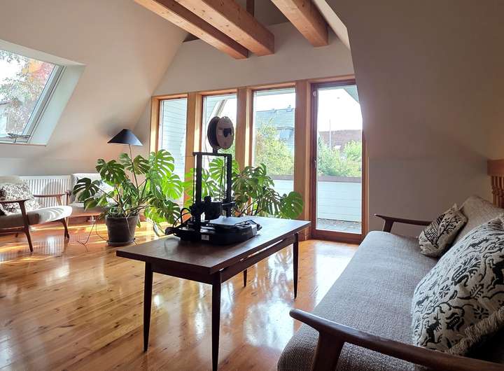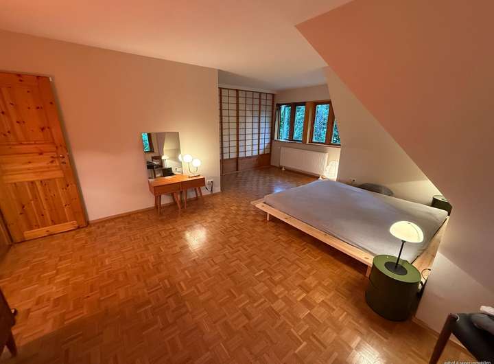 Die klar strukturierten Grundrisse lassen sich flexibel nutzen: etwa als Arbeitszimmer, Gästezimmer oder Hobbybereich. Im Dachgeschoss verleihen sichtbare Holzstrukturen und großzügige Deckenhöhen viel Wärme & Charme.