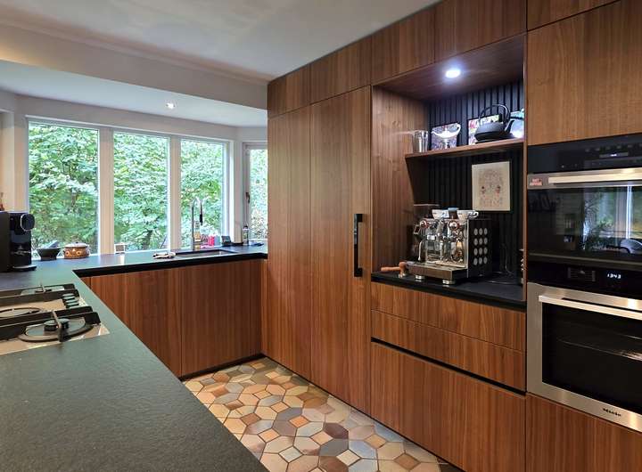 Der weitläufige Wohnbereich mit offenem Kamin lädt zu stilvollen Abenden in exklusivem Ambiente ein. Er hat eine gut durchdachte Verbindung zu Essbereich und Küche – ein Raum zum gemeinsamen Leben. Die hochwertige Einbauküche mit modernster Technik ist wie geschaffen für Genuss und Geselligkeit.
