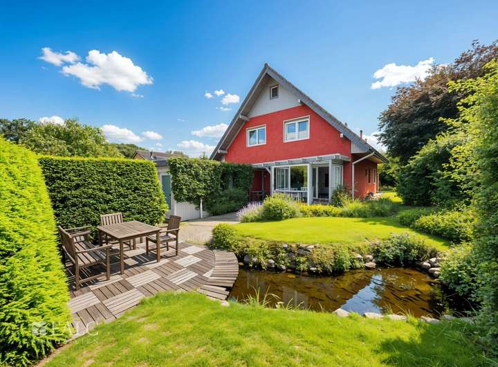 Der traumhafte Garten mit eigenem Teich lädt zu entspannten Stunden im Grünen ein – ein echtes Highlight für Naturliebhaber.