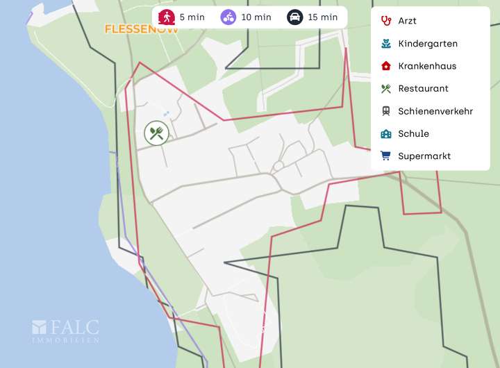 Kindergarten „Uns‘ Flinkfläuter“ und die Regionale Schule mit Grundstufe „Am Schweriner See“ befinden sich in nur etwa 2-3 km Entfernung – bequem in wenigen Fahrminuten erreichbar . Die nächste Bushaltestelle „Flessenow“ liegt nur rund 120 m vom Haus entfernt. Der nächstgelegene Bahnhof in Bad Kleinen ist etwa 2,5 km entfernt und eröffnet direkte Zuganbindungen in die Region.