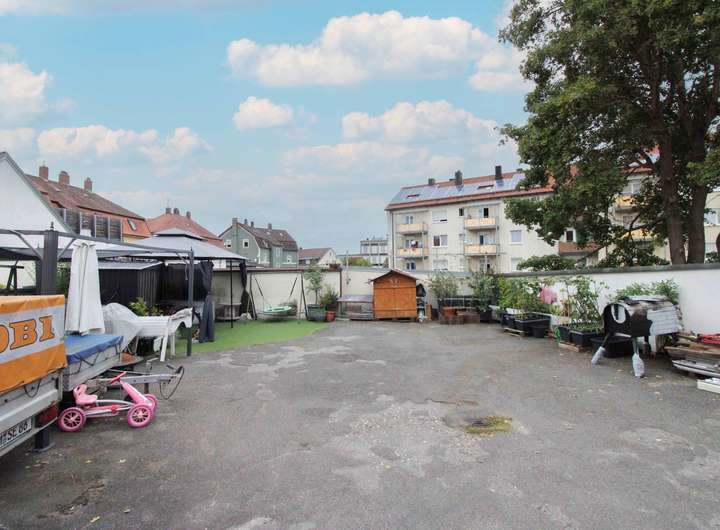 Das Haus ist zu rund 90 % unterkellert und bietet Abteile für jede Wohneinheit sowie für die Gewerbefläche. Auf dem etwa 400 m² großen Hof stehen 6 bis 8 Stellplätze für die Wohnungen und die Gewerbeeinheit zur Verfügung.