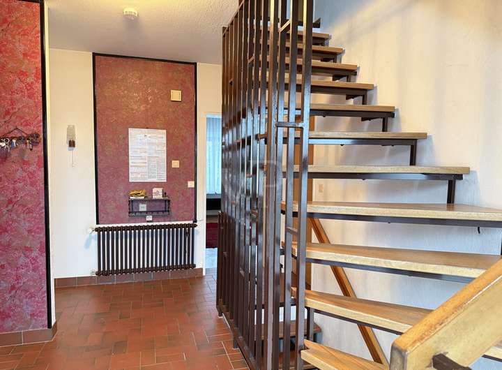 Betritt man das Haus, fällt der Blick sofort auf das offen gestaltete Treppenhaus, die praktische Garderobennische und ein Gäste-WC im Eingangsbereich.