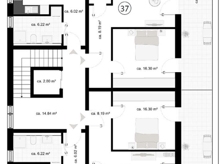Angeboten werden hier zwei baugleiche (Nummer 37 & 38), barrierefreie 2-Zimmer-Penthousewohnungen. Jede Wohnung verfügt über einen hellen Wohn- und Essbereich mit offener Küche und Zugang zu einer großzügigen Dachterrasse, ein gemütliches Schlafzimmer, ein modernes Tageslichtbad mit bodenebener Dusche und Waschmaschinenanschluss sowie einen praktischen Abstellraum. In die Wohnfläche sind 5,1 m² anteilig aus den gemeinschaftlich nutzbaren Flächen eingerechnet. Diese bieten zahlreiche Möglichkeiten für Begegnung und Aktivität. Ein großer Aufenthaltsraum (65m²) mit Teeküche und Außenterrasse lädt zum geselligen Beisammensein oder zum Empfang von Besuch ein. Für Bewegung steht ein Sportraum zur Verfügung, zusätzlich gibt es einen Raum für Physiotherapie oder diverse Pflegeanwendungen.