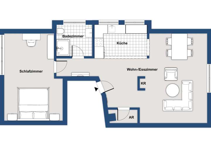 Das Herzstück der Wohnung bildet der offene Wohn- und Essbereich, der ausreichend Platz für den Alltag bietet und mit praktischen Staumöglichkeiten überzeugt. Das Schlafzimmer bietet genügend Raum für einen Kleiderschrank und weitere Möbel.