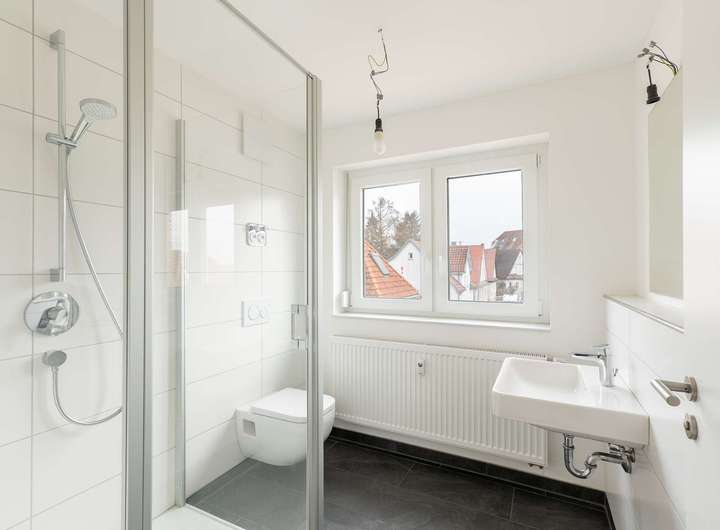 Das stilvoll geflieste Tageslichtbad ist hochwertig ausgestattet und verfügt über eine begehbare Dusche, ein Waschbecken sowie ein WC.