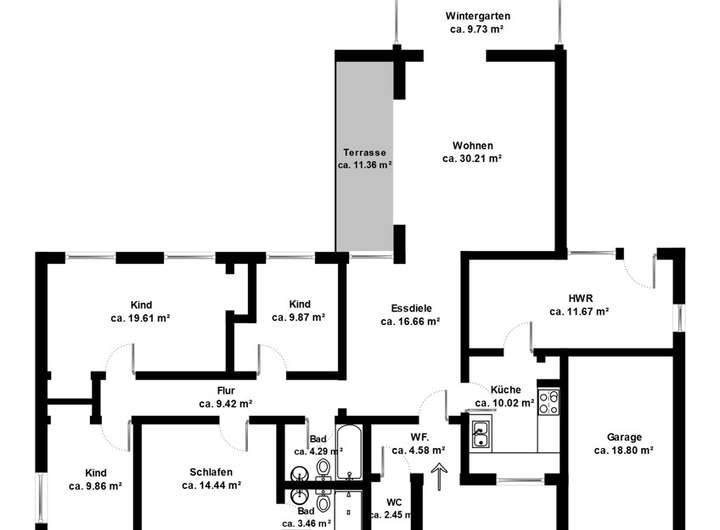 Das Haus präsentiert sich als amerikanischer Bungalow mit einer durchdachten Raumaufteilung. Es verfügt über drei ganze und zwei halbe Zimmer, darunter ein großzügiges Wohnzimmer mit angrenzendem Wintergarten, der zusätzliche Wohnfläche bietet. Die Küche ist funktional gestaltet und liegt in unmittelbarer Nähe zum Essbereich, was kurze Wege garantiert. Zwei Badezimmer, eines davon innenliegend, sowie ein Gäste-WC sind vorhanden. Der Hauswirtschaftsraum bietet zusätzlichen Stauraum und Funktionalität. Eine Garage ergänzt das Angebot und bietet Platz für ein Fahrzeug. Die Fenster wurden 2013 erneuert, was den energetischen Standard des Hauses verbessert. Der Bungalow ist in einer rückwärtigen Lage situiert, was für Ruhe und Privatsphäre sorgt. Der Zustand des Hauses ist gepflegt, jedoch könnten Modernisierungsmaßnahmen in den Bädern sinnvoll sein, um den aktuellen Wohnstandards zu entsprechen. Ein Keller ist nicht vorhanden, was bei der Planung des Stauraums berücksichtigt werden sollte. Dafür steht jedoch ein Dachboden zur Verfügung, der sich hierfür gut eignet.