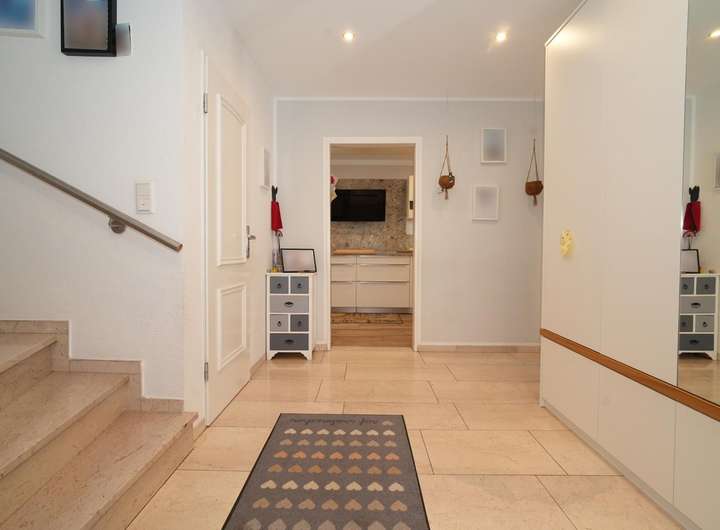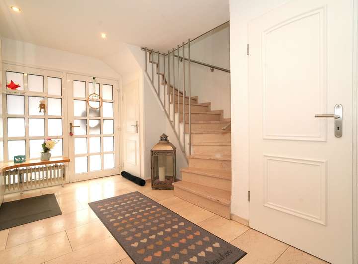 Sie betreten die Immobilie in einem hochwertig mit Marmor gefliesten und hellen Eingangsbereich. Von diesem erreichen Sie sowohl das große Wohnzimmer mit edlem Stäbchenparkett und Austritt auf die Terrasse, wie auch das Gäste-WC und die Küche.