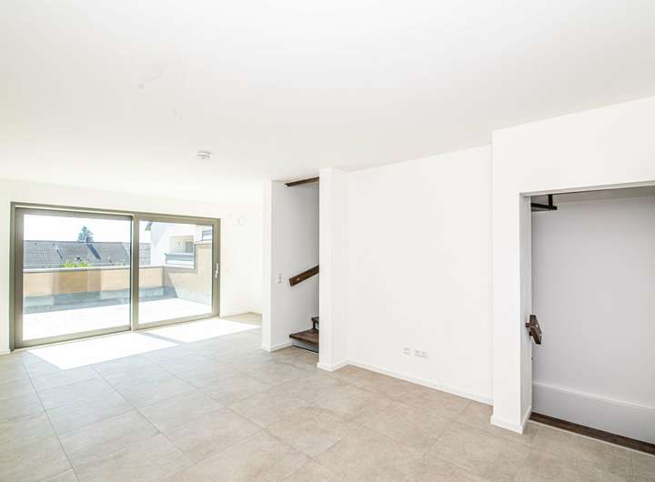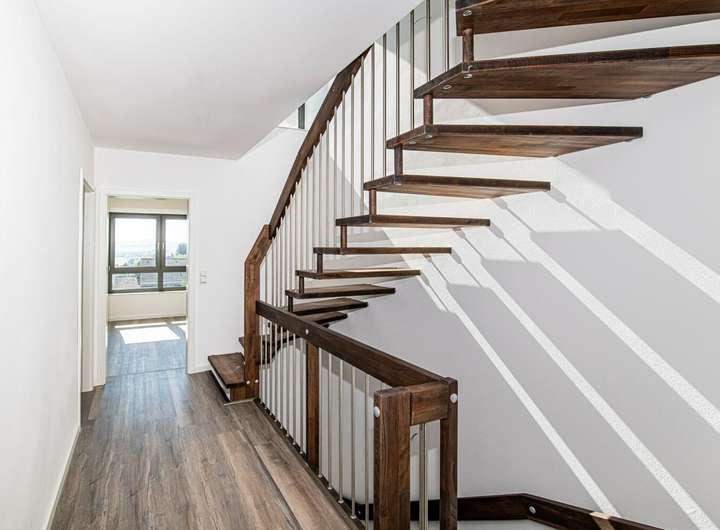 Das Erdgeschoss empfängt Sie mit einem Windfang und einer Garderobe, die direkt in das großzügige Wohn- und Esszimmer münden. Die offene Küche bietet ideale Voraussetzungen für gemeinsames Kochen und gesellige Abende. Vom Wohnbereich gelangen Sie direkt auf die private Terrasse, die zu entspannten Stunden im Freien einlädt. Ein Gäste-WC rundet das Raumangebot auf dieser Ebene ab und erhöht den Wohnkomfort.