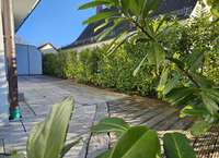 Der Grundriss des Hauses bietet viel Platz für die ganze Familie: vorhanden sind 3 Schlafzimmer, ein großes und voll ausgestattetes Badezimmer, zudem im Erdgeschoss ein Gäste-WC, eine Abstellkammer, die geräumige Küche sowie das großzügige Wohnzimmer mit Ausrichtung nach Süden und Zugang zur Terrasse. Die Terrasse ist mit Grünpflanzen eingefasst.