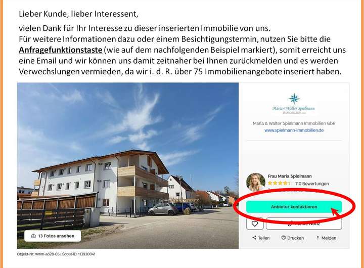 Bei Interesse zu diesem Angebot bitten wir um eine Kontaktanfrage (türkisfarbene Funktionstaste bei Immobilienscout24) mit Angabe von Namen und Anschrift.