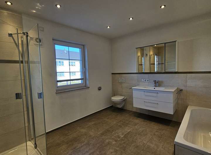 - Badezimmer mit Badewanne, großer Dusche, Waschtisch mit Unterbauschrank und Spiegelschrank