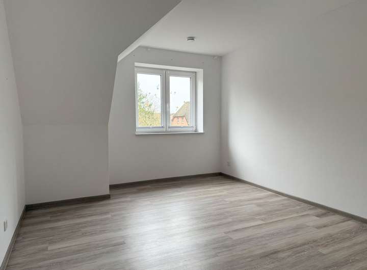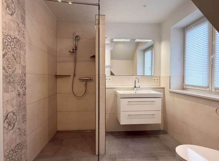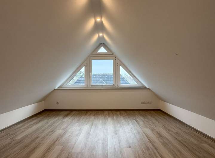 Die Haushälfte verfügt über ca. 144 m² Wohnfläche aufgeteilt auf drei Etagen. Im Erdgeschoss befinden sich zwei geräumige Zimmer, die Küche mit moderner Einbauküche und Durchreiche ins Wohnzimmer, ein Gäste-WC mit bodengleicher Dusche und einen Hauswirtschaftsraum mit Nebeneingang. Im Dachgeschoss gibt es drei gut geschnittene (Schlaf-)Zimmer sowie ein zweites Badezimmer mit ebenerdiger Dusche. On Top gibt es den ausgebauten Spitzboden mit einem weiteren WC.