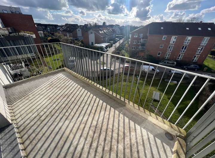 Vom Wohnzimmer aus erreichen Sie direkt den Balkon, der zu entspannten Stunden im Freien einlädt und ausreichend Platz für eine kleine Sitzgruppe oder Pflanzen bietet.