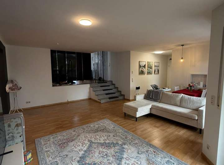 Sie überzeugt durch einen großzügigen und außergewöhnlichen Schnitt sowie zwei gegenüberliegende Balkone. Eine Empore teilt das Wohnzimmer in zwei Ebenen und verleiht dem Raum eine besondere Atmosphäre. Das Badezimmer ist mit einer großen Badewanne ausgestattet.