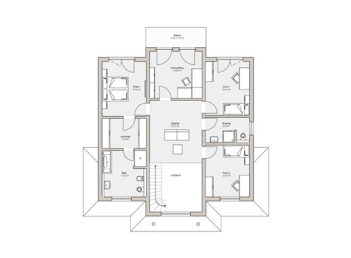 Im Obergeschoss gelangt man von der Galerie in zwei Kinderzimmer mit separatem Bad, in ein Home-Office mit einem direkt angrenzenden Balkon und in das Haupt-Schlafzimmer. An dieses Schlafzimmer grenzen ein Ankleideraum sowie das eigene Wellness-Badezimmer, das mit viel Fläche zum Entspannen einlädt.