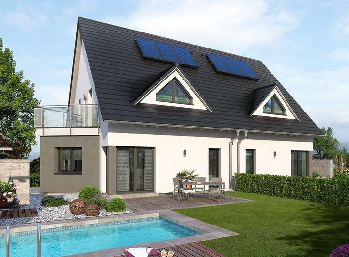 Dabei können Sie unsere Fertighäuser ganz nach Ihren eigenen Wünschen gestalten. Sowohl die Dachform (Satteldach, Walmdach, Flachdach oder Pultdach) als auch zusätzliche Bauteile wie Erker, Balkon oder Giebel sind frei wählbar.
