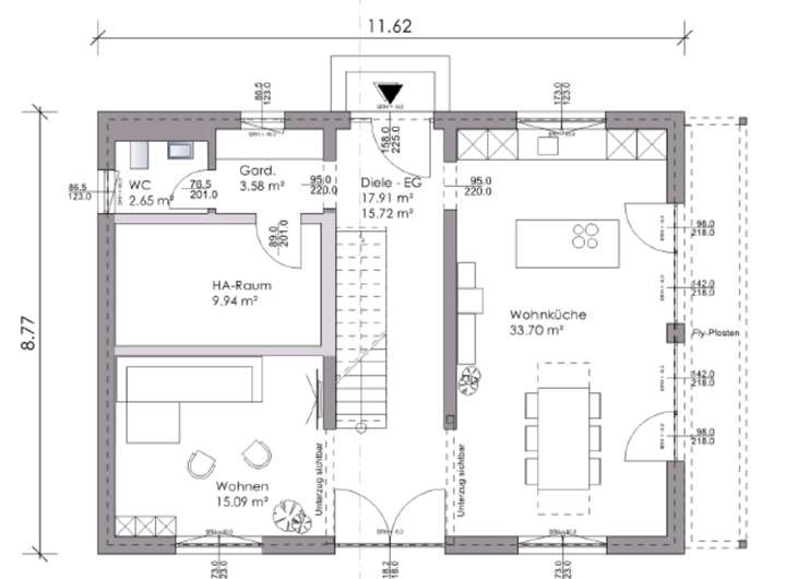 Der Hausentwurf auf Bodenplatte ist aber nur ein Bebauungsvorschlag und kann noch ganz nach Ihren Wünschen verändert oder auch durch eine Neuplanung ersetzt werden.