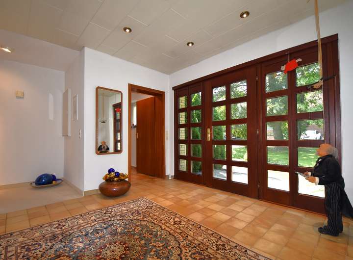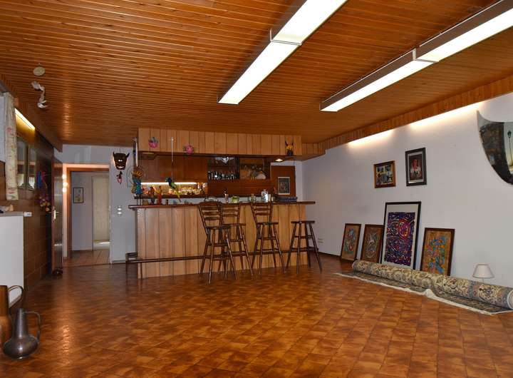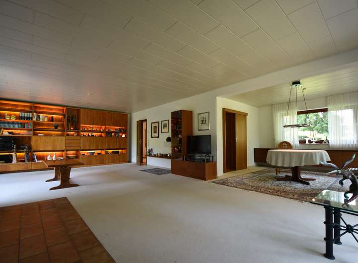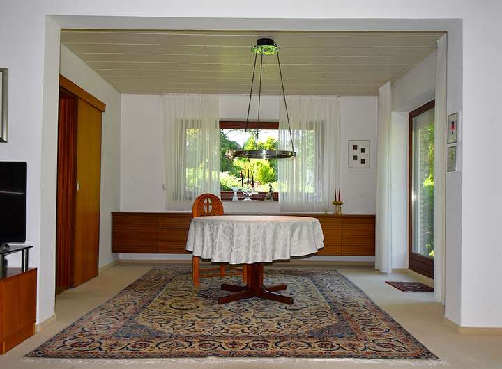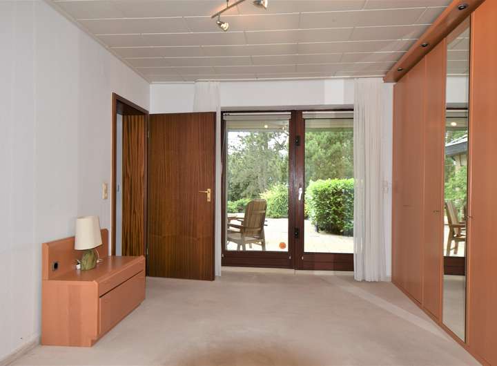 Das perfekte Haus für Ihre Familie! Alle Räume befinden sich auf einer Ebene im Erdgeschoss. Dazu ist der Bungalow vollunterkellert und bietet neben einem Gästezimmer und einem Partyraum weitere Wohnqualität. Das bereits teilausgebaute Dachgeschoss kann bei Bedarf erweitert werden. Beim Betreten des Bungalows gelangt man in einen hellen und offen gestalteten Eingangsbereich. Von hieraus sind der Wohn- und Küchenbereich sowie der Schlafbereich mit den Badezimmern erreichbar. Links vom Eingangsbereich befindet sich die Küche, die mit einer Schiebetür zum angrenzenden Wohn-Essbereich verbunden ist. Dort sind bodentiefe Fenster verbaut, die für einen großen Lichteinfall sorgen. Dadurch ist das Wohn und-Esszimmer hell und gemütlich. Rechts vom Eingangsbereich führt ein langer Flur an zwei Schlafräumen, dem hellen Tageslichtbad und einem extra Gästebad mit Dusche vorbei und endet im ruhig gelegenen Schlafzimmer. Die beiden Bäder sind deckenhoch gefliest und jeweils mit einer Dusche, einem Waschbecken, einem WC und einem Fenster ausgestattet. Das Badezimmer verfügt zusätzlich über eine Badewanne und ein zweites Waschbecken. Alle Räume sind mit einem hellen Teppichboden ausgelegt. Lediglich im Eingangsbereich, der Küche und dem Zwischenflur sind Bodenfliesen verbaut. Das gesamte Erdgeschoss verfügt über eine Fußbodenheizung. Die teilüberdachte Terrasse ist im Wohnzimmer und im Schlafzimmer über bodentiefe Fenstertüren erreichbar. Von der Terrasse hat man einen wundervollen Blick in den idyllischen Garten und kann ruhige Sonnenstunden verbringen. Über zwei massiv eingebaute Treppen gelangt man in das Dachgeschoss und in den Keller. Im teilausgebauten Dachgeschoss sind zwei Dachflächenfenster aus Holz eingebaut. Der Boden ist mit Teppich ausgelegt und die Wände und Decken sind mit Holzvertäfelungen verkleidet. Ebenfalls sind hier Strom und Licht bereits verbaut. Der gesamte Bungalow ist unterkellert. Hier befindet sich ein Partyraum mit eingebauter Theke und zwei Heizkörpern. Des Weiteren sind im Keller ein weiteres Badezimmer mit Dusche, ein Gästezimmer, der Hausanschlussraum, sowie zwei weitere Kellerräume.