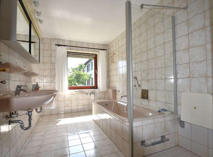 • Tageslichtbad mit bodentiefer Dusche, Badewanne und zwei Waschbecken