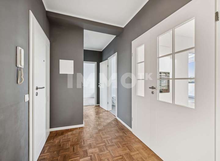 Bereits beim Betreten der Wohnung fällt der hochwertige Gesamteindruck auf: Eine moderne Wohnungseingangstür eröffnet den Zugang zu einem einladenden Flurbereich. In der gesamten Wohnung – mit Ausnahme der modern gefliesten Sanitärräume – ist edles Stäbchenparkett verlegt, das für ein warmes und harmonisches Wohngefühl sorgt.