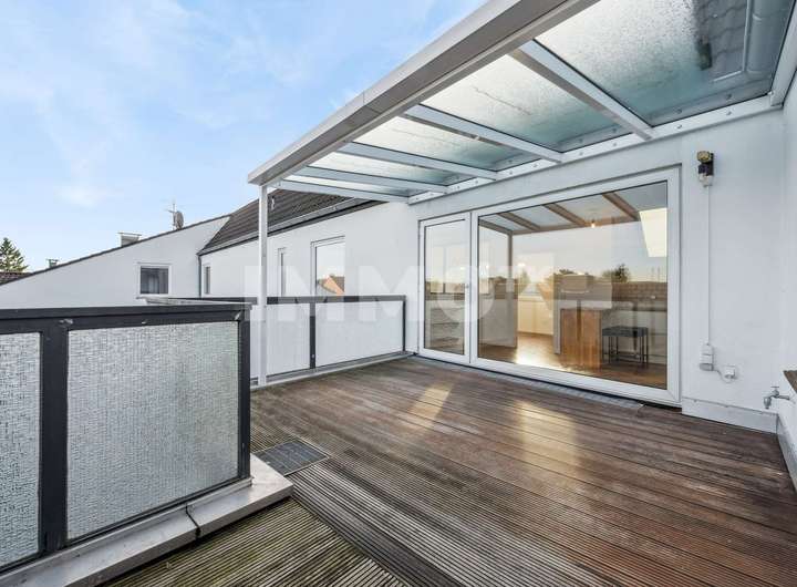 Ein Highlight ist die großzügige, größtenteils überdachte Dachterrasse, die dank ihrer ruhigen Innenhoflage absolute Privatsphäre bietet. Strom- und Wasseranschlüsse ermöglichen eine vielfältige Nutzung – ein perfekter Ort, um bei jedem Wetter Zeit im Freien zu genießen.
