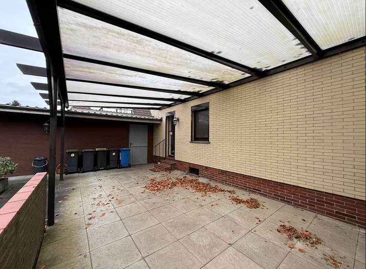 Der Außenbereiche des Hauses ist mit einer überdachten Terrasse, die zum Entspannen und Genießen einlädt, gestaltet. Der Garten ist pflegleicht angelegt.
