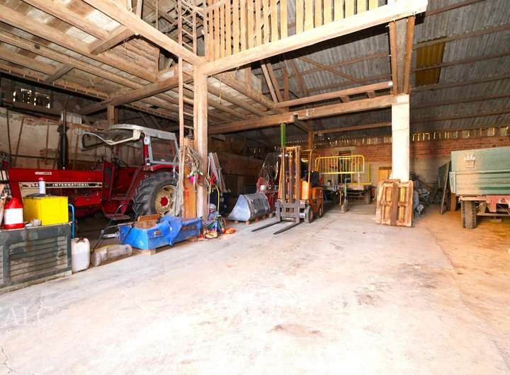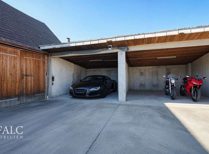 Zu diesem Anwesen gehört eine Garage, ein Carport, ein Fahrradschuppen, eine Scheune mit über 340 m² inklusive Hobbyraum und eine Maschinenhalle mit über 87 m², in deren Räumlichkeiten eine Werkstatt mit Hebebühne Platz finden könnte.
