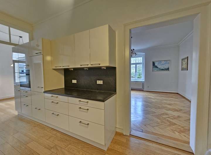 Vom zentralen Dielenbereich gelangen Sie in das weitläufige Wohnzimmer sowie in das ruhig gelegene Schlafzimmer. Die großzügige Einbauküche bildet das Herzstück der Wohnung – hier ist Platz zum Kochen, Genießen und Zusammensein. Angrenzend befindet sich das stilvolle Esszimmer, das sich ideal für gemütliche Abende anbietet.