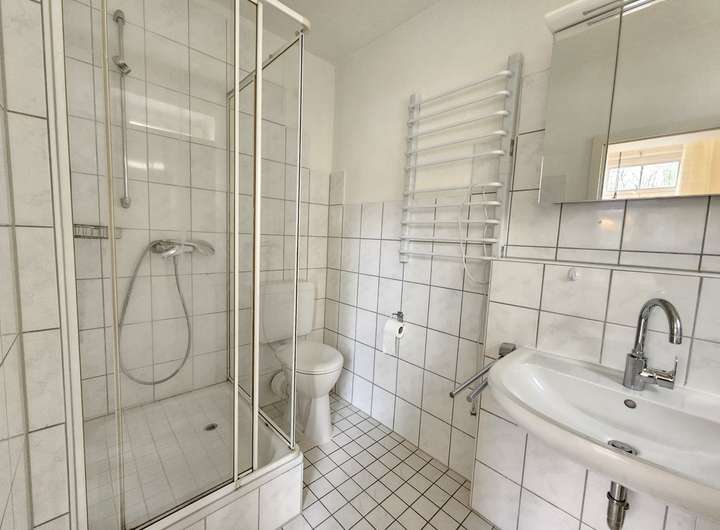 Das Badezimmer ist mit Dusche, WC, Waschbecken und einem praktischen Handtuchheizkörper ausgestattet.