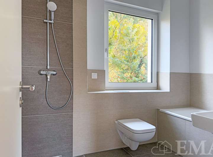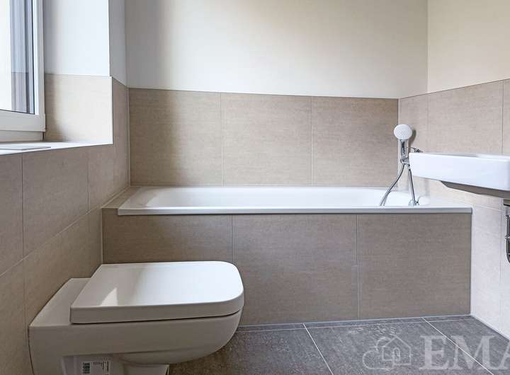 - Badezimmer im Obergeschoss mit Badewanne und bodengleicher Dusche