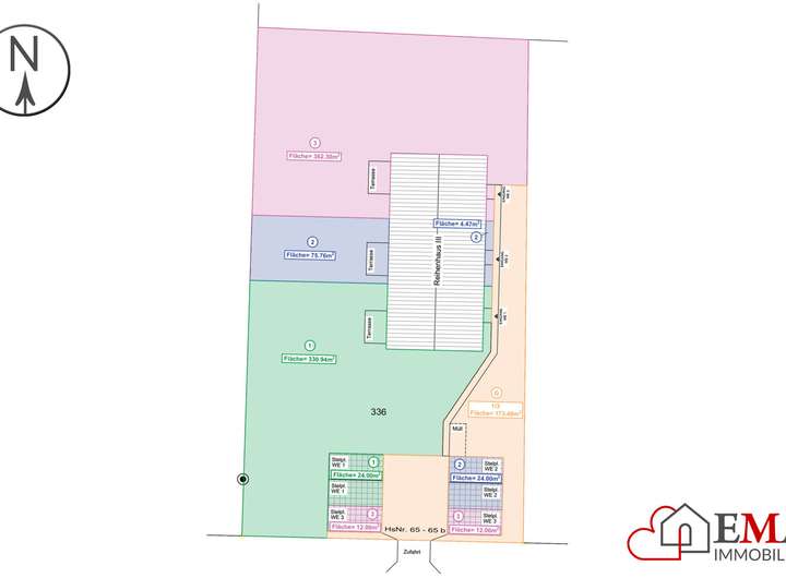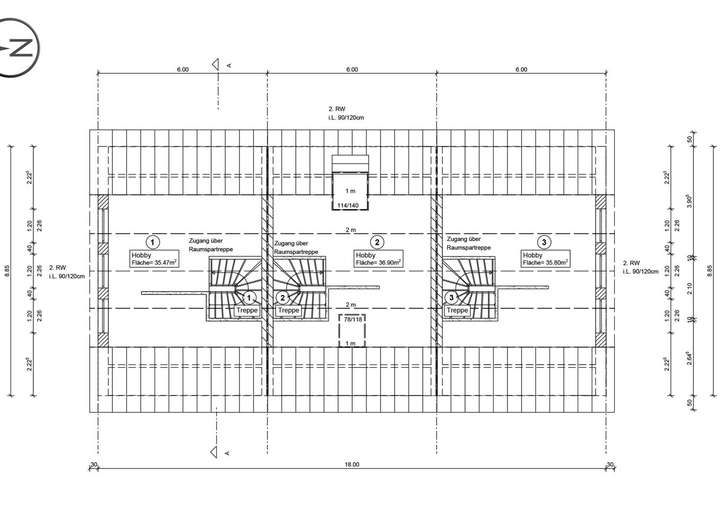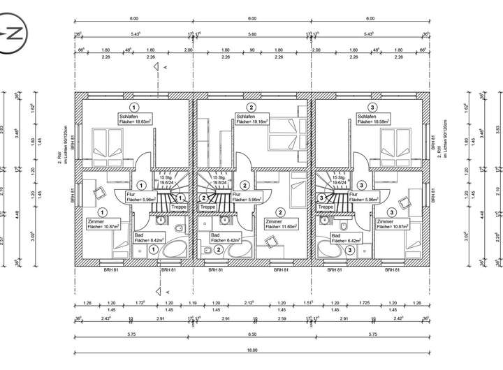 Die Anlage besteht aus zwei Reihenend- und einem Reihenmittelhaus, die sich jeweils aufteilen in Erdgeschoss, Obergeschoss und Dachgeschoss.