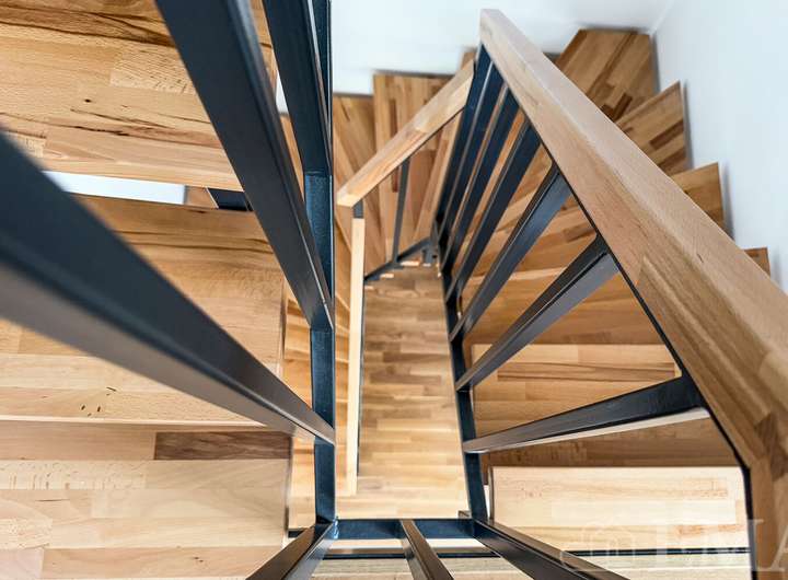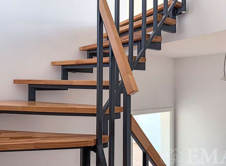 - Geschosstreppe als lackierte Stahlkonstruktion mit Massivholzstufen