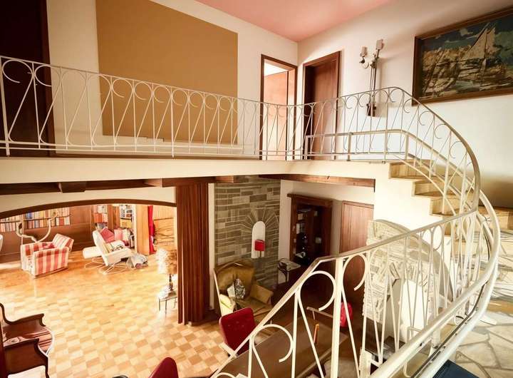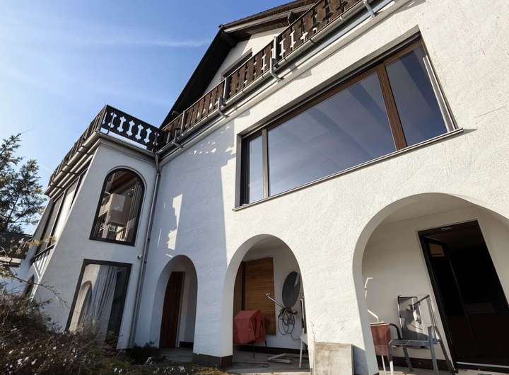 Bereits beim Betreten des Hauses empfängt Sie ein großzügiges Foyer, von dem aus alle Ebenen über mehrere Treppen erreichbar sind – ein architektonisches Highlight, das dem Haus eine besondere Raumwirkung verleiht. Die mediterran anmutende Architektur mit ihren charakteristischen Rundbögen an der Außenfassade verleiht dem Anwesen den charmanten Charakter eines Ferienhauses im Süden.