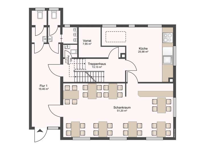 Die Gewerbefläche umfasst 113 m² und wurde zuletzt gastronomisch betrieben. Ein aktuelles Brandschutzkonzept ist vorhanden. Denkbar ist eine erneute Nutzung im Gastronomiebereich, ebenso wie eine Umgestaltung zu Praxis- bzw. Büroräumen oder eine Umnutzung zu Wohnraum – je nach Bedarf und Konzept.