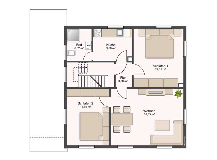 Im Obergeschoss befindet sich eine vermietete Wohnung mit einer Wohnfläche von 91,75 m² – ideal zur sofortigen Renditeerzielung.